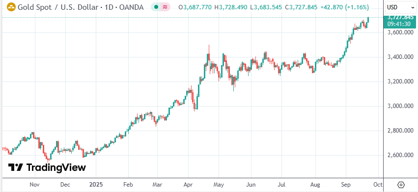 发稿前不久,现货金价最高涨至每盎司3728.42美元,较上周三录得的前高高出了20美元,日内涨幅超1.1%;美国黄金期货主连价格最高至每盎司3763.1美元,也创下新高,日内涨超1.5%。